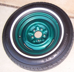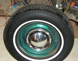 The original rims and tires, complete with dogdish hubcaps. These were