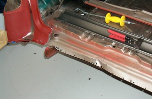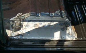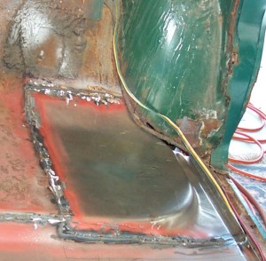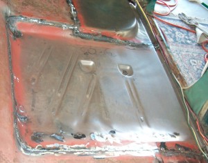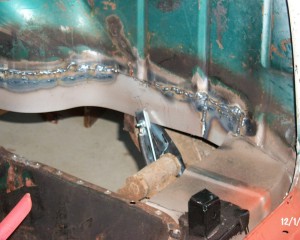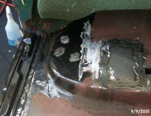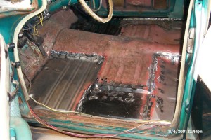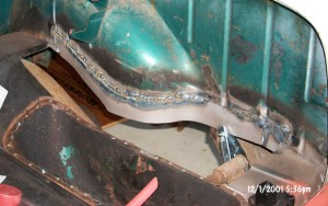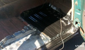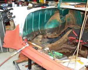 What really slows up a restoration project is moving. The family had expanded again by this time, so we all decided a bigger house with a 3 car garage was needed. A flatbed tow truck was called to move Betsy. Many of her loose pieces were packed in her for the move, to protect the edges from being bumped around and to protect small fingers from rusty edges. After that move, the trunk floor replacement was started. |
