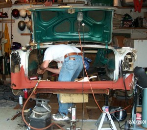 Once the body was stabilized with new floor pans, rocker panels, tailpan, and trunk floor, it was time to lift the body off the frame. When you see this on television at the pro shops, you see a bunch of big, muscled men pick up the body and carry it away. I wish everything was that easy for the average restorer at home.When your child says that he doesn't need to know math to work on cars, just show him the next page. Kurt fashioned a frame, calculated the balance point of the body, then built a rotisserie that could hold the body and rotate it and still clear the floor and the ceiling. He also had to figure out a lifting system and the balance point to pick the body up without dropping it due to the heavy trunk area.All in all, a mathematical exercise. |