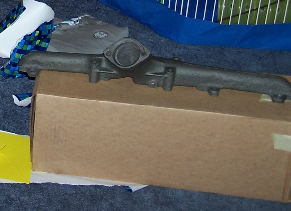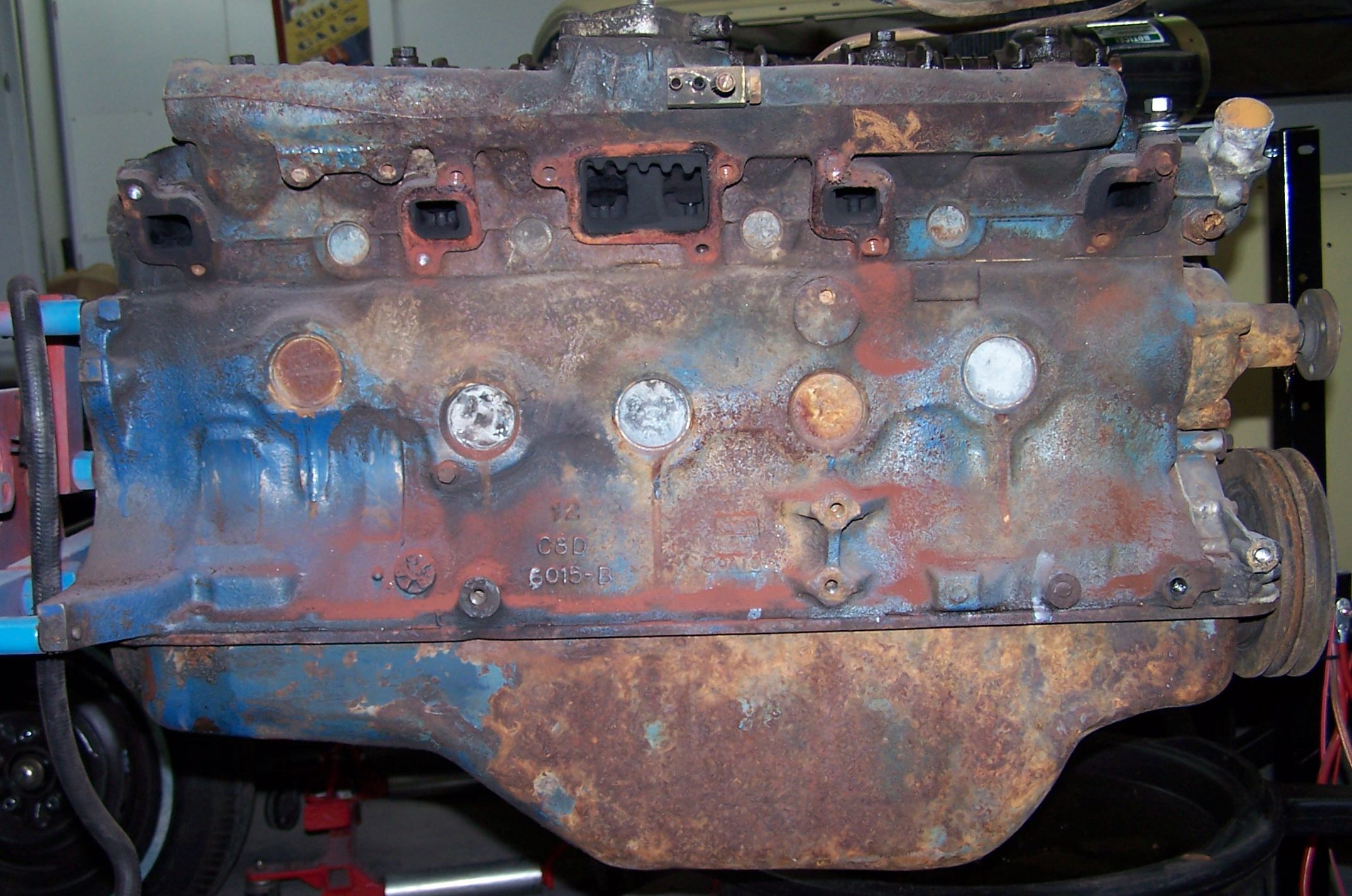 The exhaust manifolds were removed to check for cracks, which are common in these old log style manifolds. The five freeze plugs are obvious here. With the two groove pulley and altenator boss, this donor came out of a car with either air conditioning or power steering.