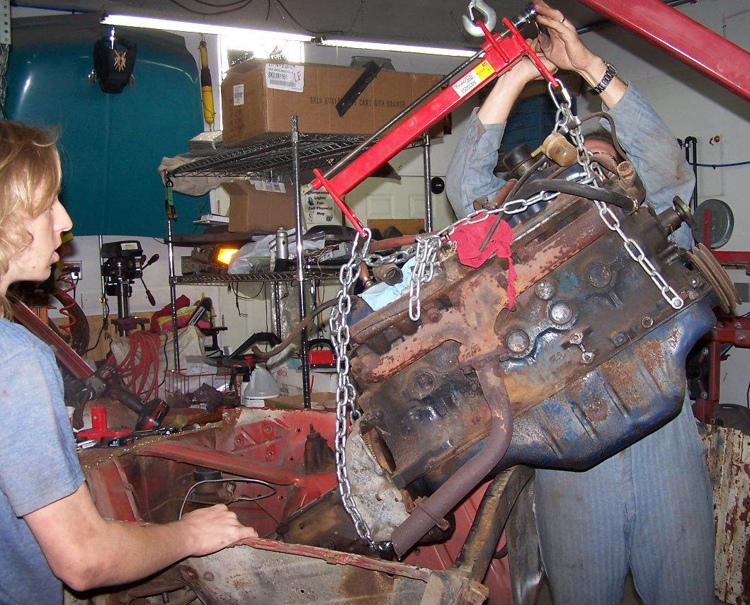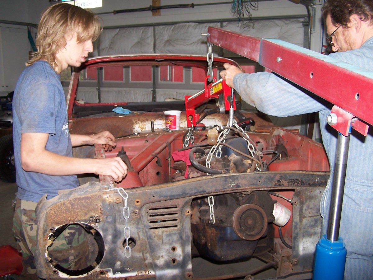 Time to remove the original engine. By this point, the rest of the car has been disassembled, the floor pans replaced and it is almost time to go onto the rotisserie.