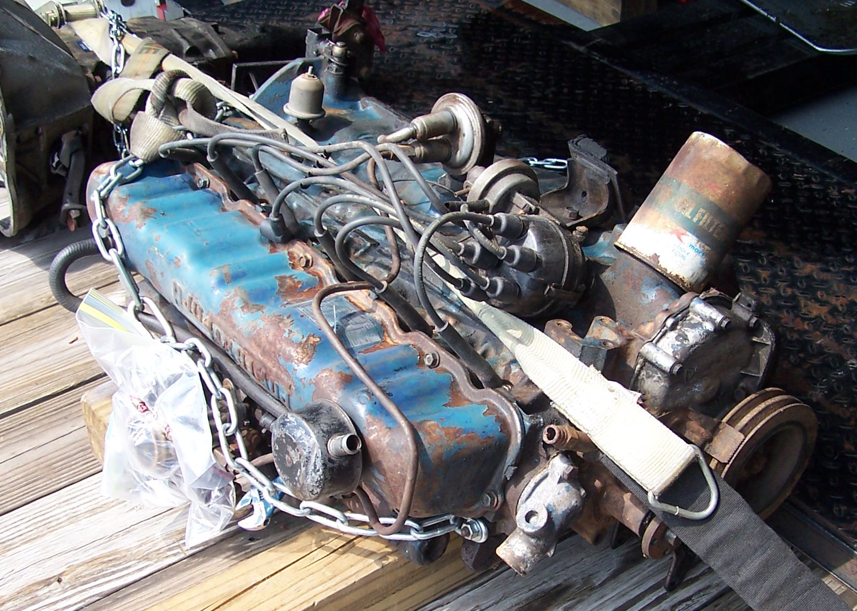 The three speed transmission from the donor engine is strapped to the trailer and headed to a car wash for a bath to remove most of the caked on dirt and oil. The shifter box indicates a floor shift, not a column shift.