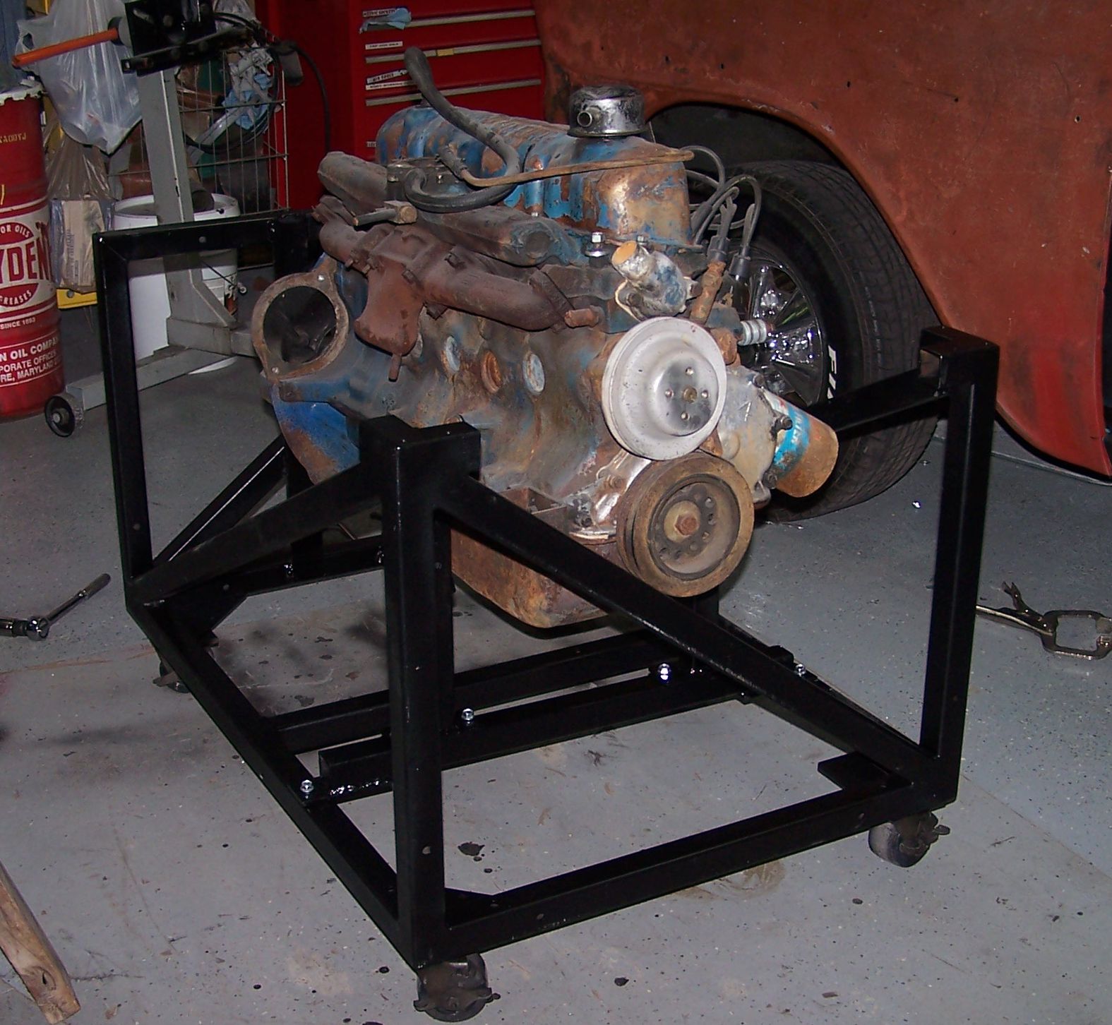 Through the winter, Dad finished the engine stand, turning it into a test stand where he could run an engine, complete with radiator, starter switch, and ignition circuit.