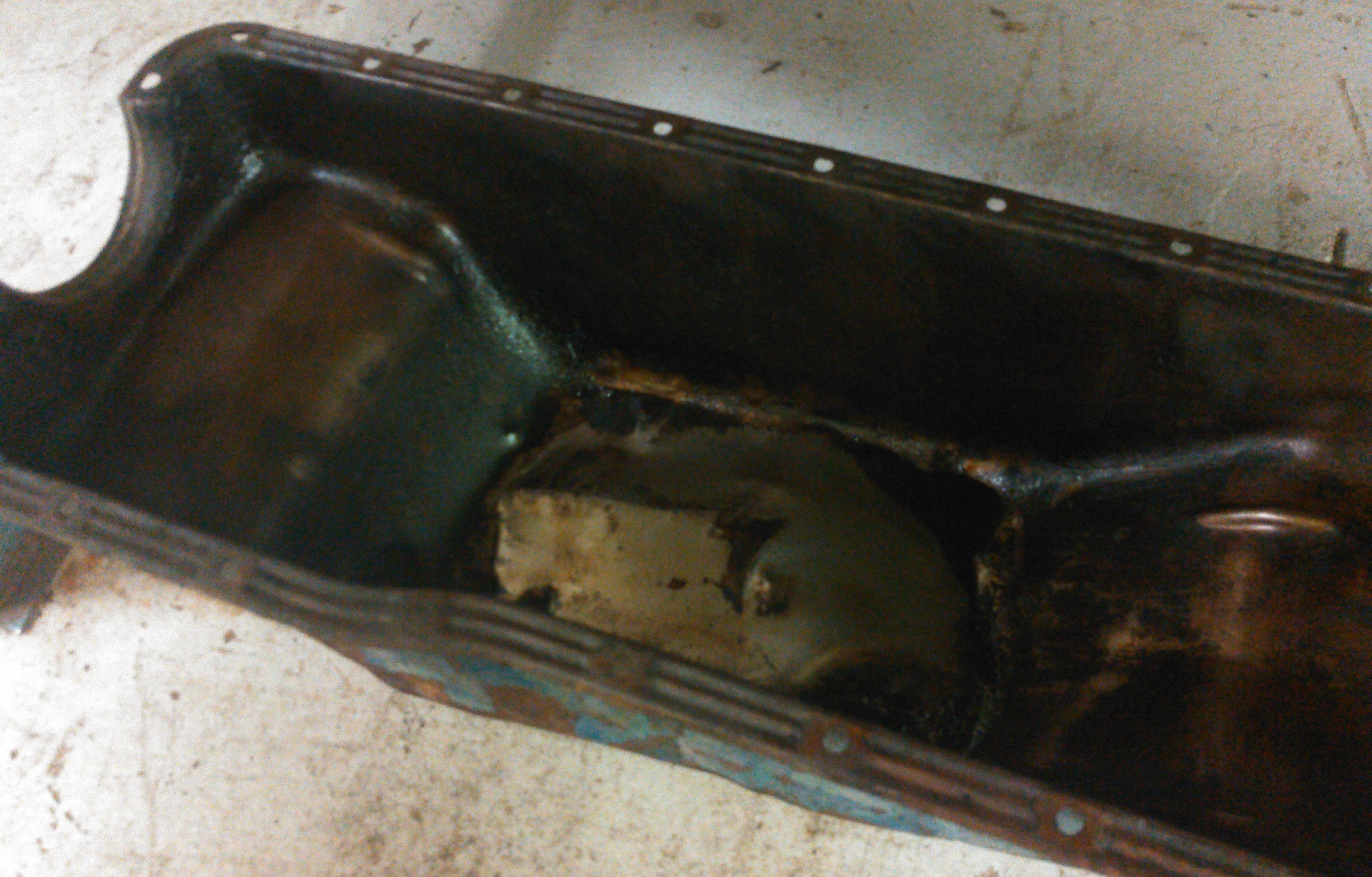 The old oil pan has a large dent in the bottom. That was metal worked out as much as possible.
