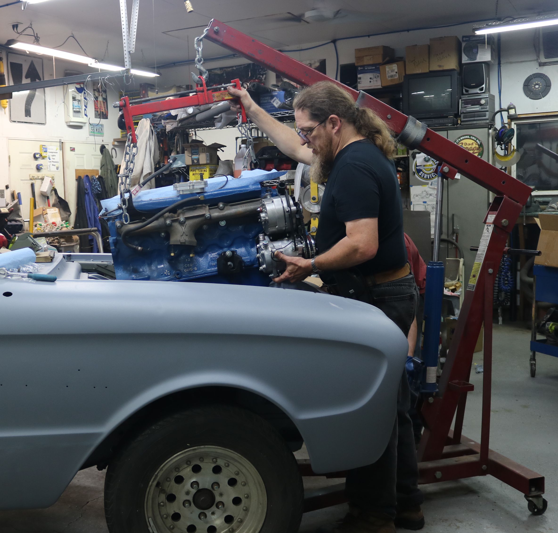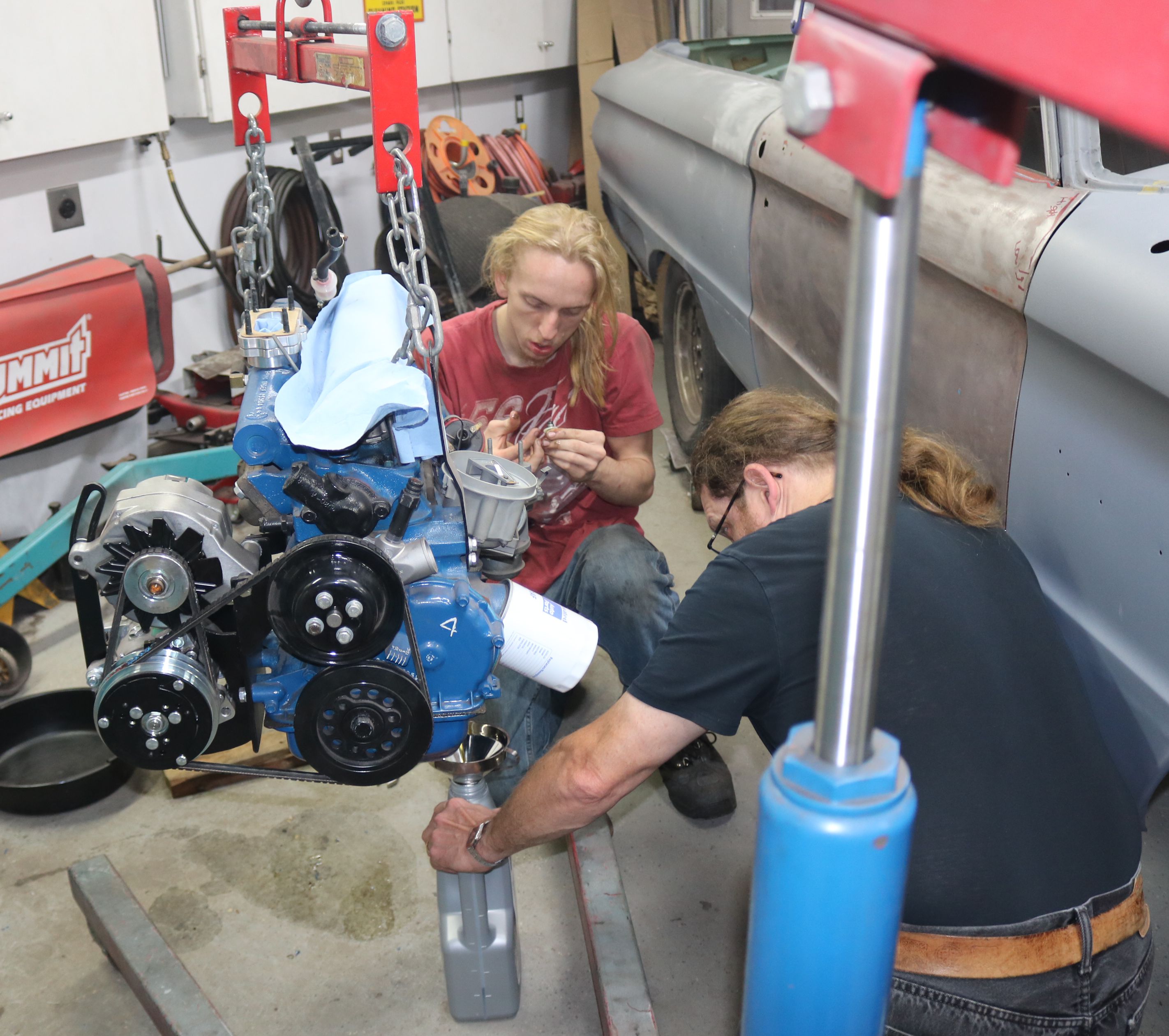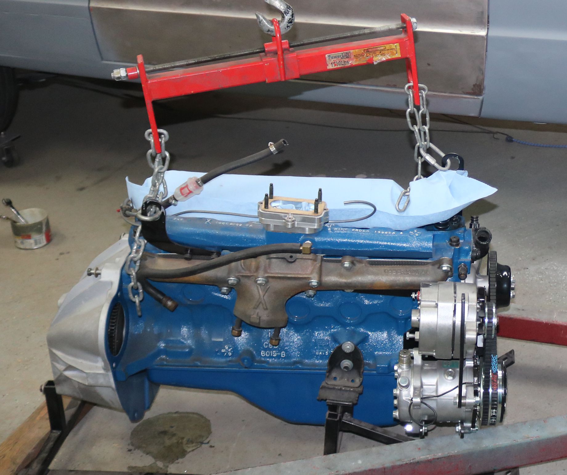 Time to lift the engine up enough to clear the body. We took the car off the