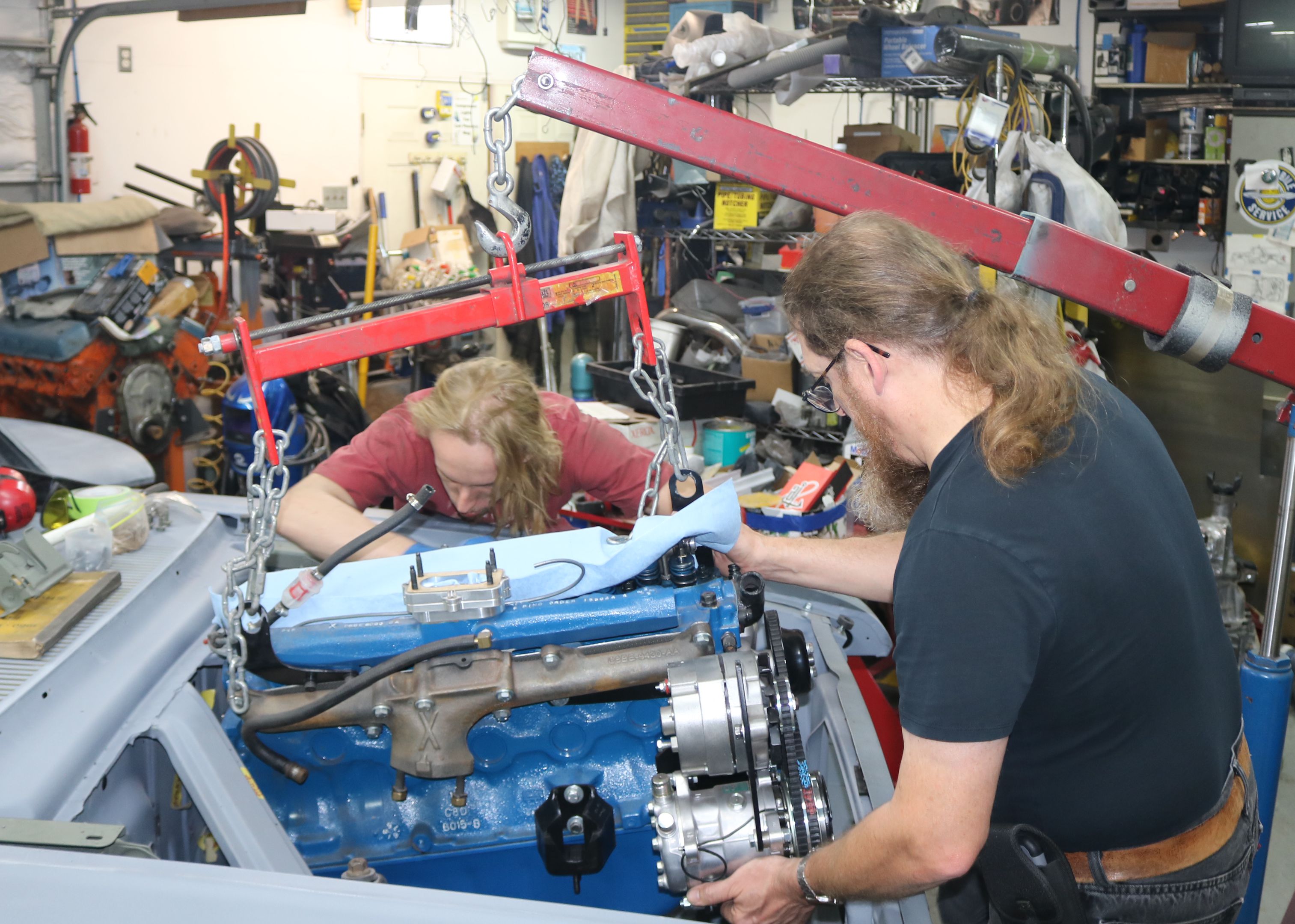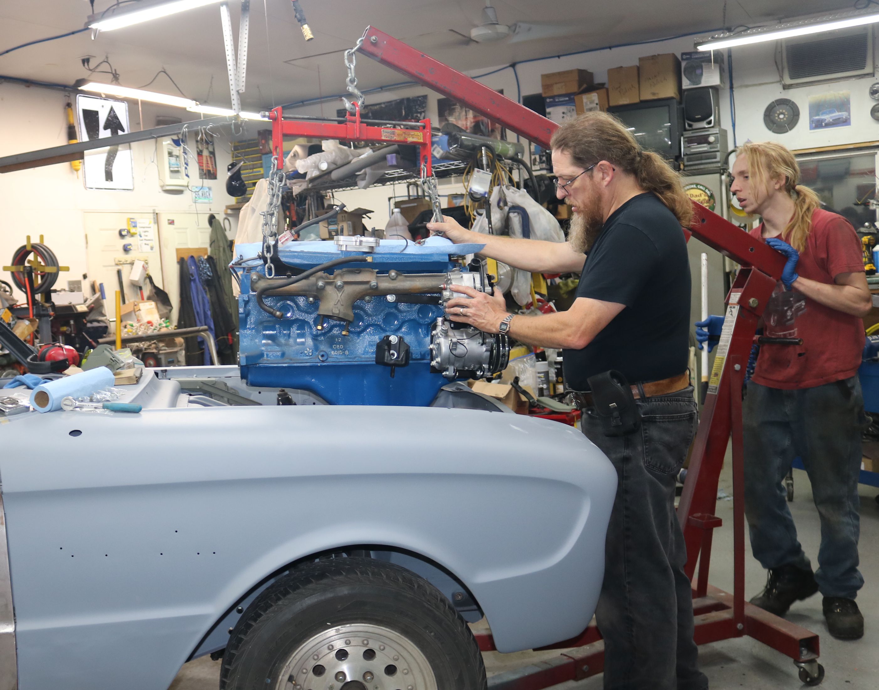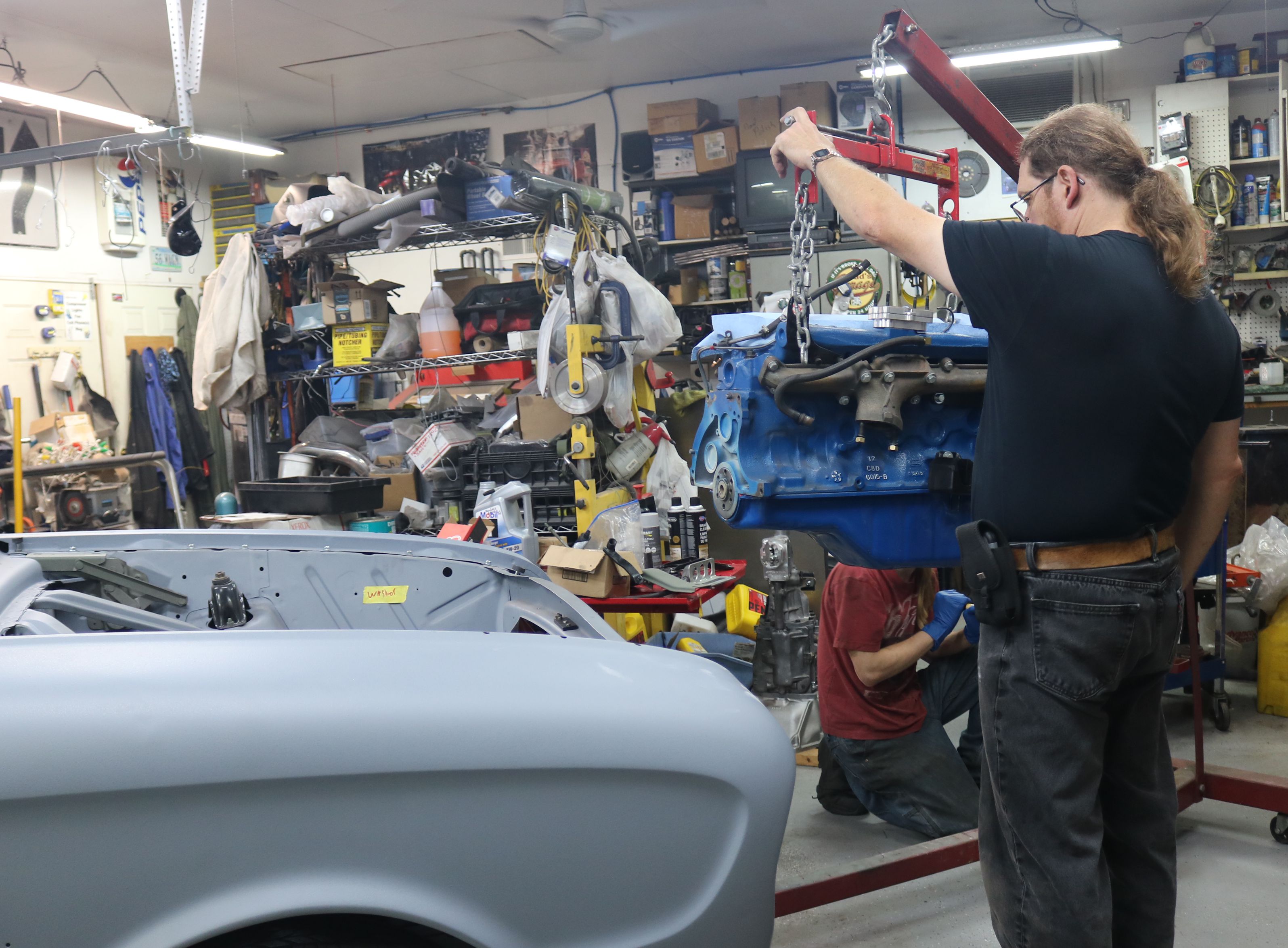 Time to lift the engine up enough to clear the body. We took the car off the