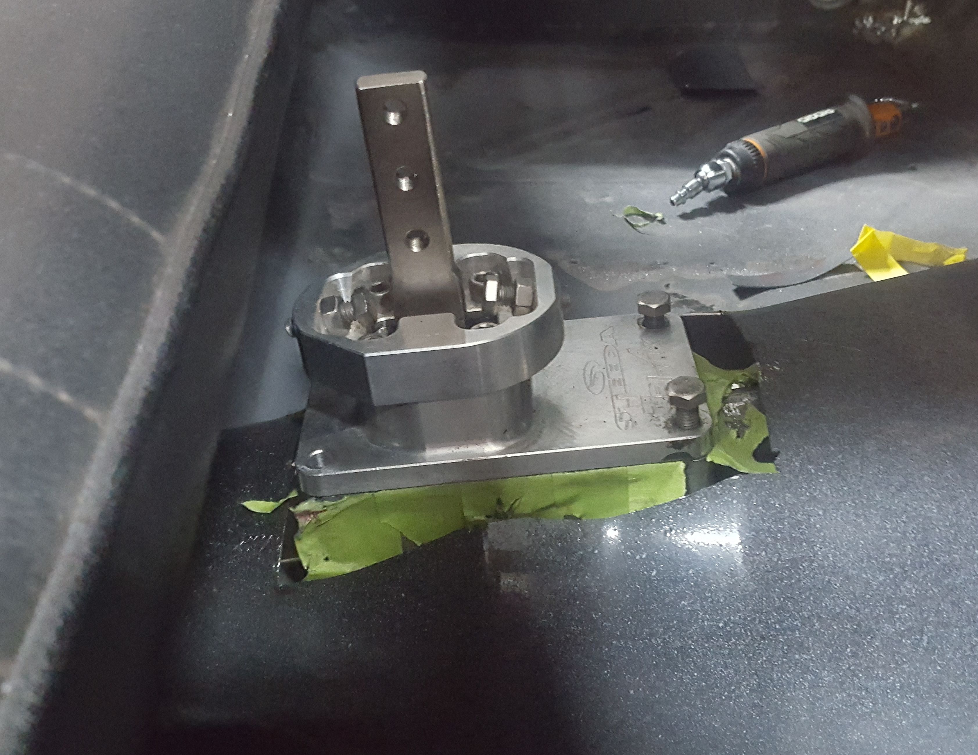 The newly fabricated shifter boot hold down.
