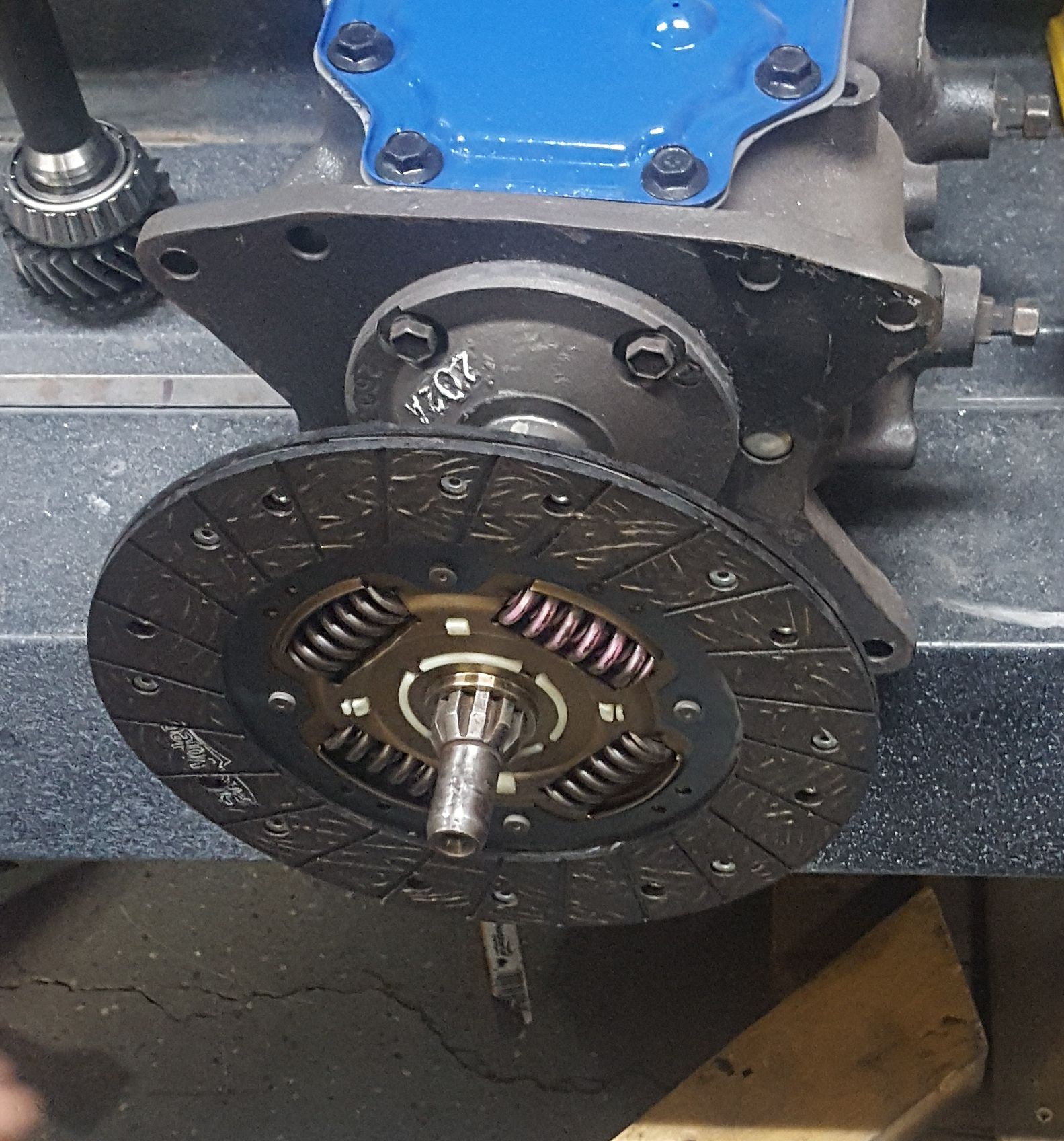 This is the new new transmission, removed to figure out the input shaft issue. The clutch disc is not sliding on. The splines are too wide for the clutch disc.