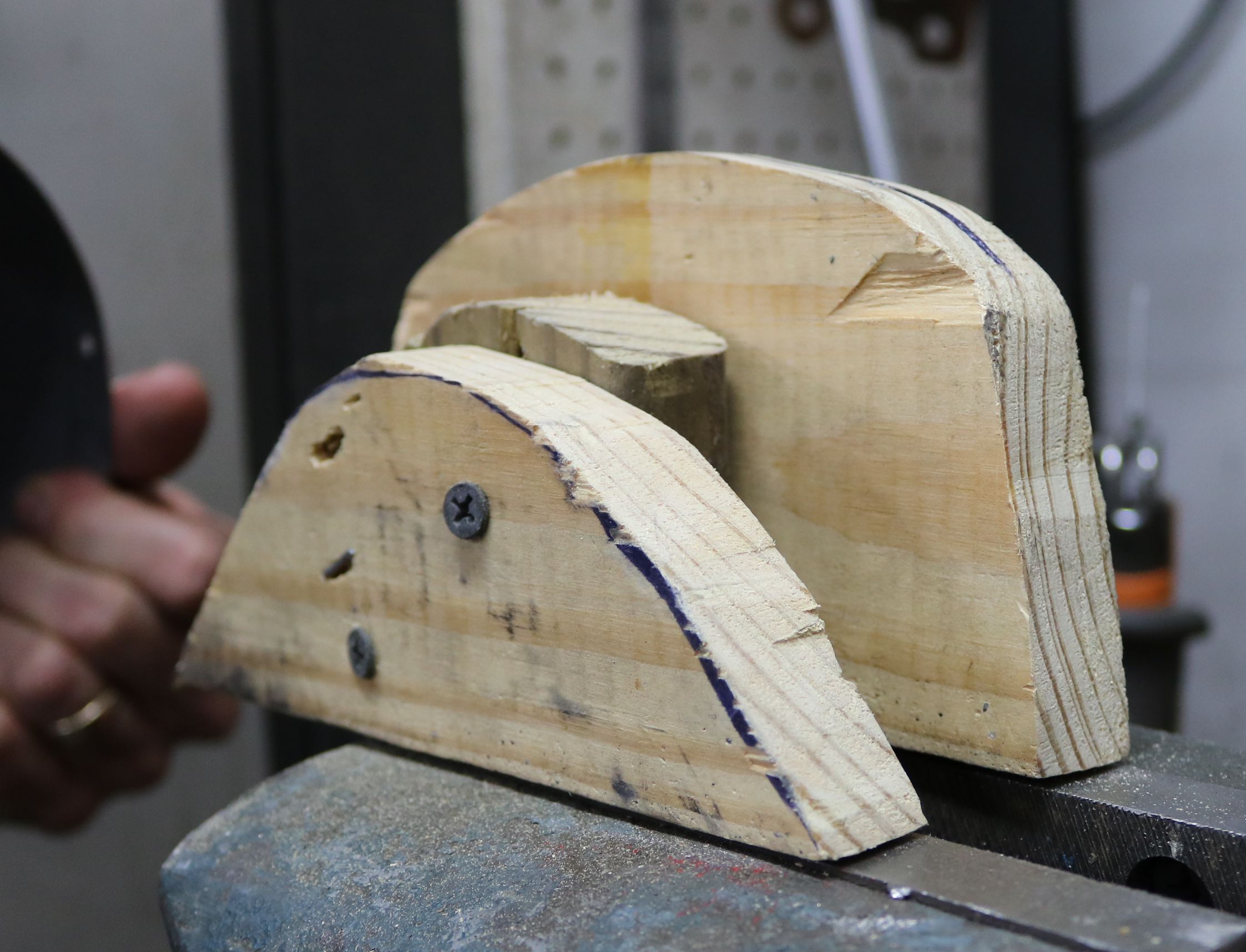 A wooden form helped to bend the back of the new shifter hold down.